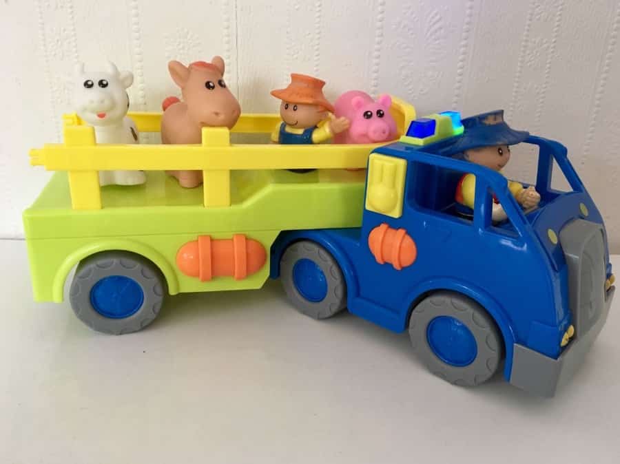 Blue Farm Truck & Green Trailer 1 x Farmer with blue hat 1 x Farmer with orange hat 1 x Horse 1 x Pig 1 x Cow