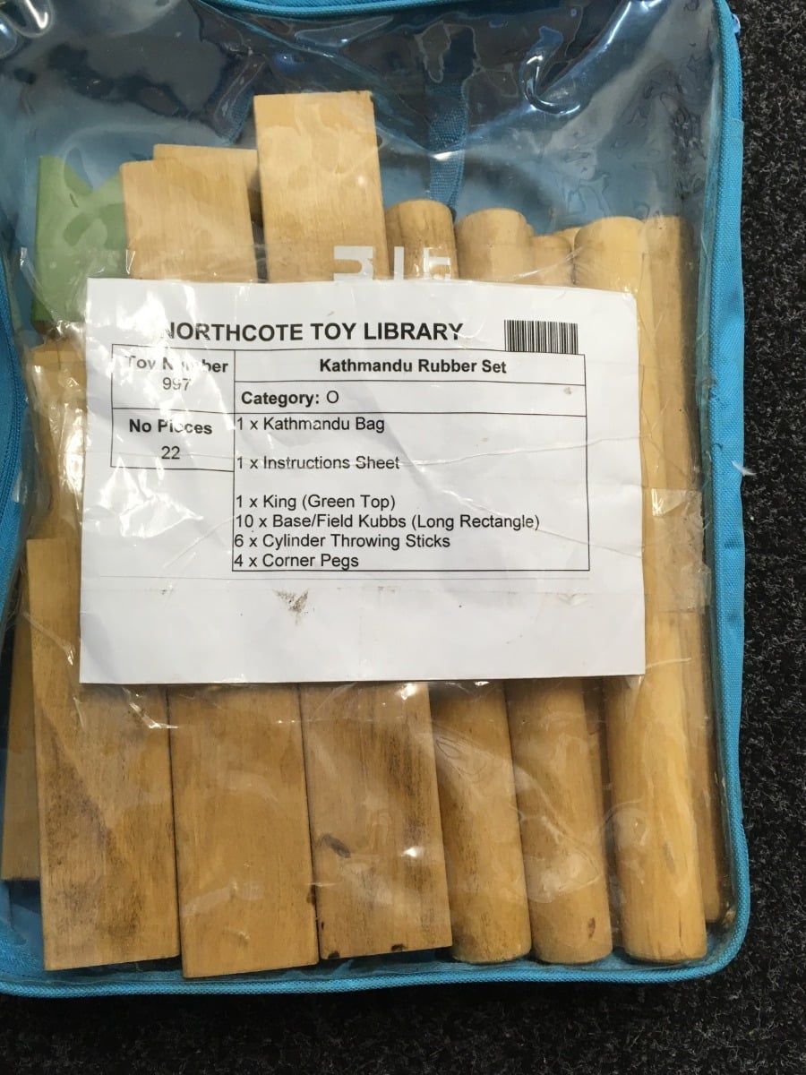 23 pieces + toy library bag 1 x Kathmandu Bag, 1 x Instructions Sheet, 1 x King (Green Top), 10 x Base/Field Kubbs (Long Rectangle), 6 x Cylinder Throwing Sticks, 4 x Corner Pegs