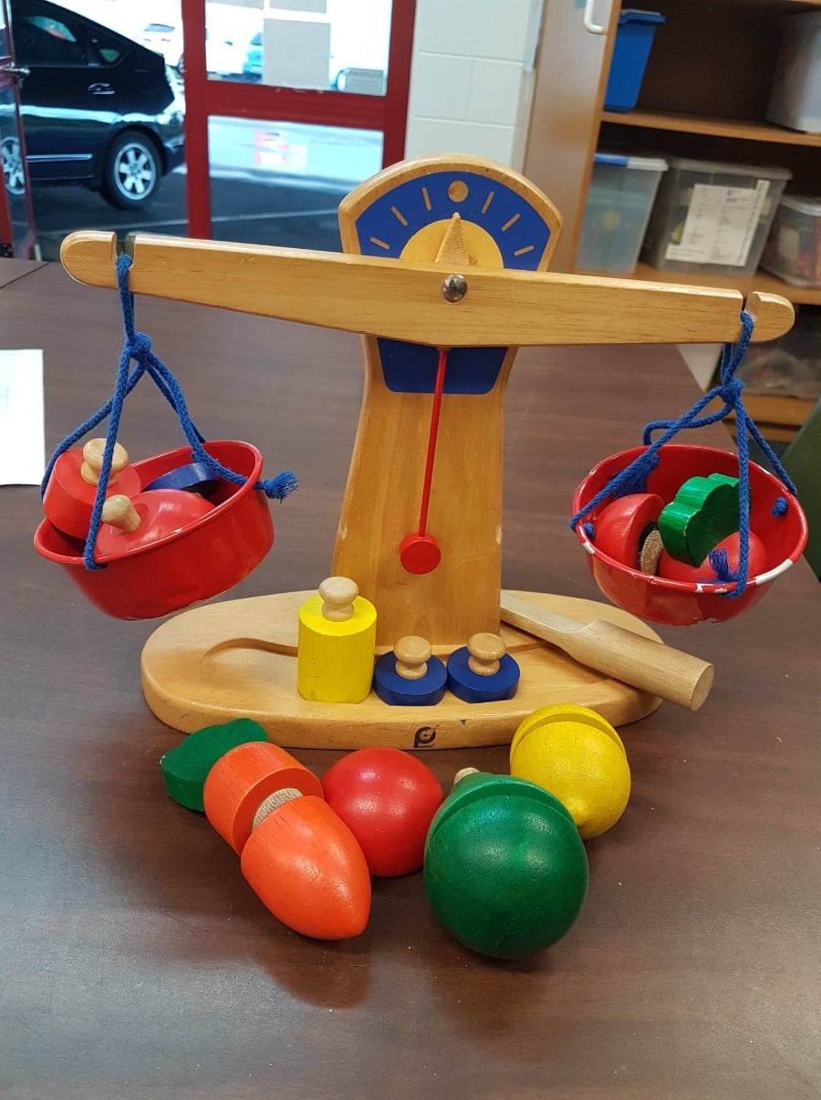 20 Pieces,1 x scales ,2 x red weighing cups ,3 x blue weights ,1x yellow weights ,1x red weight,1 x knife,2 x pieces of carrot,2 x pieces of radish,2 x pieces of pear,2 x pieces of apple,2 x pieces of lemon,1 x toy library bag