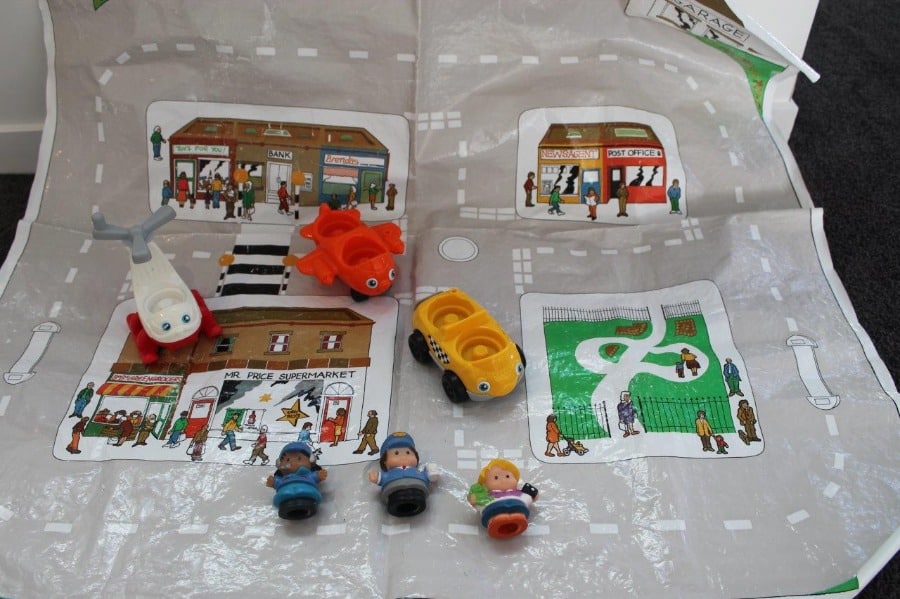 8 Items,1x Toy Library Bag,1x Playmat,1x Helicopter,1x Yellow Taxi,1x Orange Plane,3x People