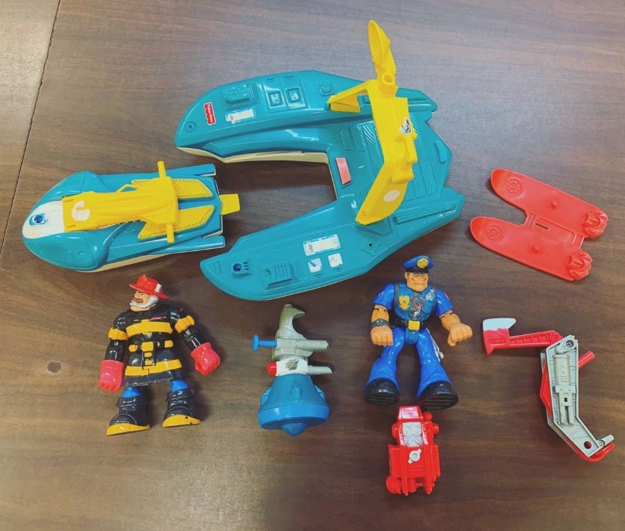 8 pieces + 1 Bag,1x rescue vessel,1x jet ski,1x fire fighter,1x police officer,1x water skis,1x fire fighter backpack with axe,1x police water cannon,1x outboard motor,1 x toy library bag